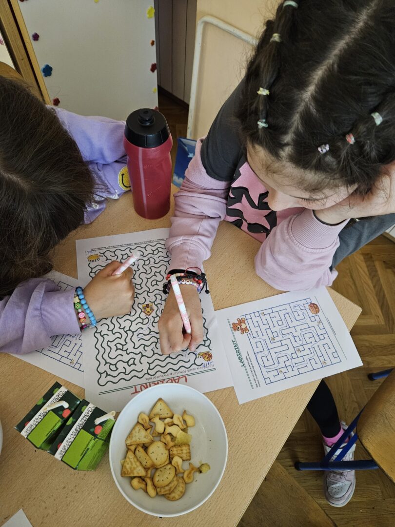 U sklopu etwinning projekta „Na putu dobrote 6“, učenici 3.a razreda su kroz razne aktivnosti iskazali empatiju i podršku osobama s Down sindromom. Kroz kratki video uratak i informativni letak učenici su prvo upoznali što je to Down sindrom. Zajedničkim čitanjem knjige „Vedrina suncokreta“, autorice Nataše Šunić Vargec, upoznavajući Miu, djevojčicu s Downovim sindromom učenici su pobliže upoznali najčešća karakteristična obilježja djeteta s Downovim sindromom, ali i njezine životne rutine, aktivnosti, druženja s prijateljima…Uslijedio je razgovor o priči i izdvajanje najvažnijih poruka koje nam je Mia poslala kroz svoju životnu priču. Nakon toga učenici su riješavali labirint u obliku čarape u kojem je trebalo pomoći dječaku i djevojčici s Down sindromom pronaći put do penjalice. Za kraj je svaki učenik dizajnirao svoje šarene čarape kao znak podrške osobama s Down sindromom. Sažetak naših aktivnosti donosimo vam kroz fotografije.