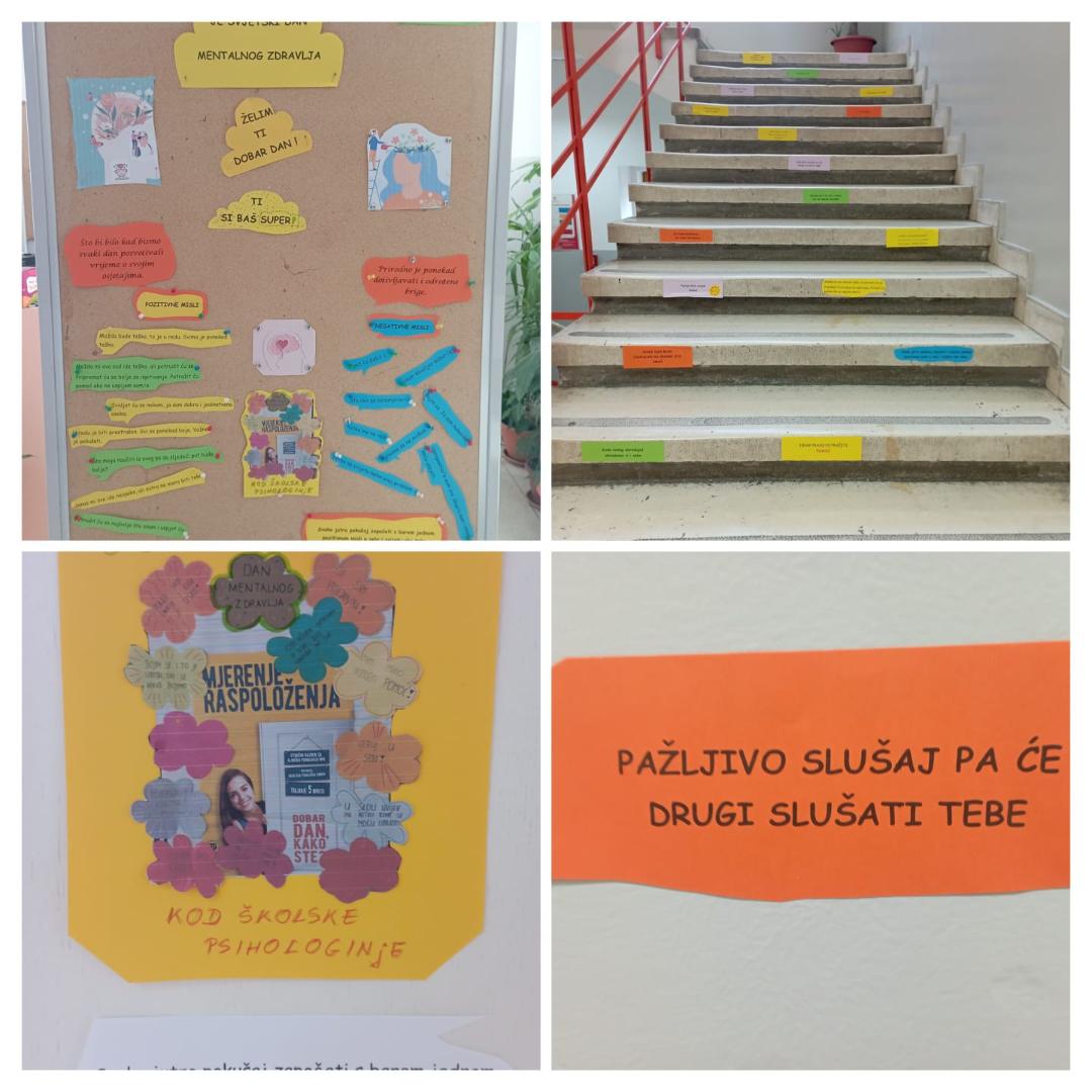 Povodom svjetskoga Dana mentalnoga zdravlja 10.10. dočekale su nas na hodnicima škole ohrabrujuće i motivirajuće poruke koje bismo svakoga dana mogli ponavljati sebi i jedni drugima, a posebno kada dođu teški trenutci u danu. Naša psihologinja Grozdana Matanović podsjetila nas je kako riječ ima veliku moć i svojim djelovanjem može osnažiti učenika i vratiti snagu za rad.